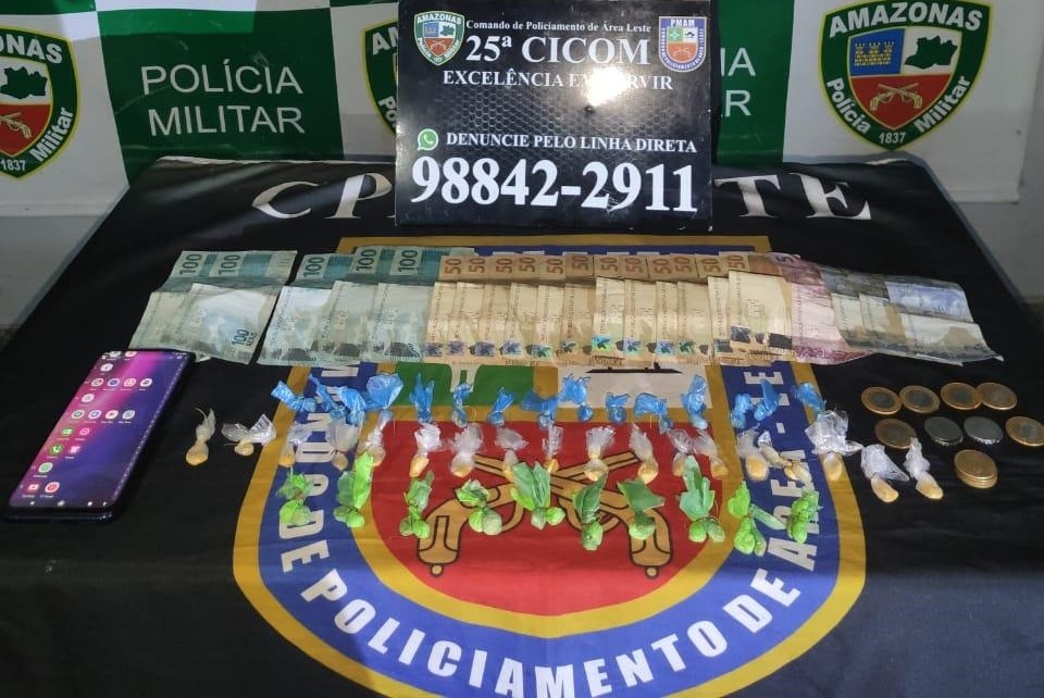 Os policiais militares das viaturas 6368 e 6362 faziam policiamento por volta das 4h quando, durante incursão na rua Projetada, no Zumbi, depararam-se com jovem, que ao fugiu ao avistar a viatura. As equipes conseguiram deter o suspeito e, durante revista pessoal, encontraram com ele 29 porções de substâncias ilícitas supostamente pasta base; 24 porções possivelmente oxi; R$ 1.119,50 em espécie, possivelmente da renda do tráfico, além de um aparelho celular.