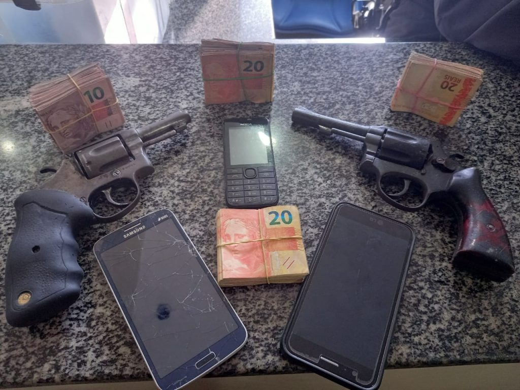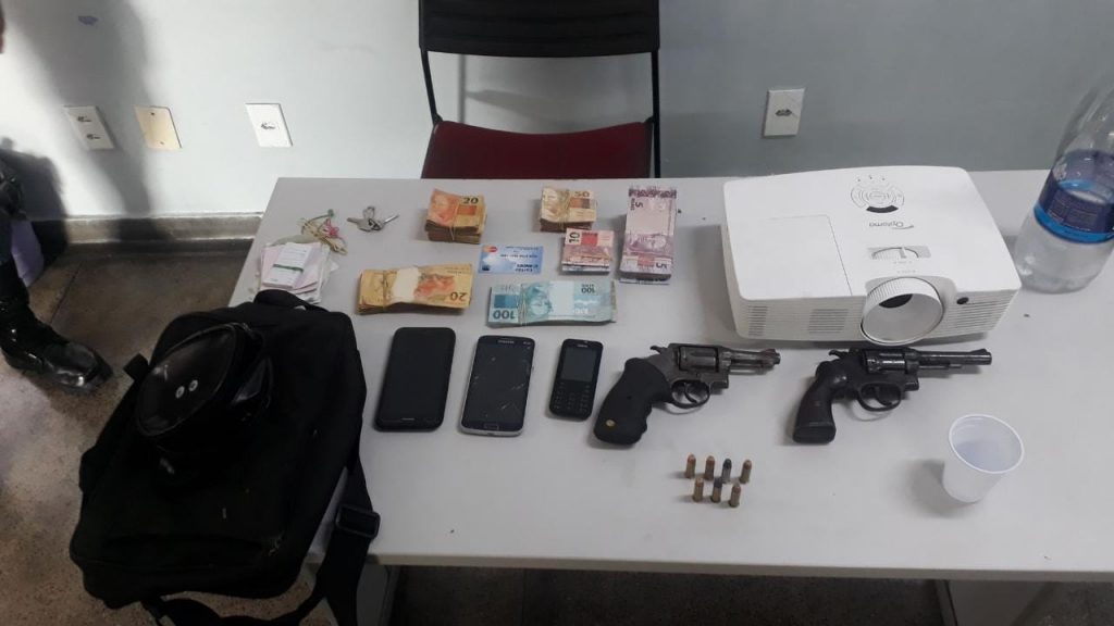 O quarteto foi abordado e rendidos, passaram por revista, sendo encontrado dois revólveres calibre 38, um com numeração aparente e outro suprimida, seis munições calibre 38 intactas, a quantia de R$ 8.470 em espécie, três aparelhos celulares, um aparelho retroprojetor, uma mochila preta, uma motocicleta XRE vermelha placa 3157 e uma motocicleta XRE vermelha, placa NBP 6C96.