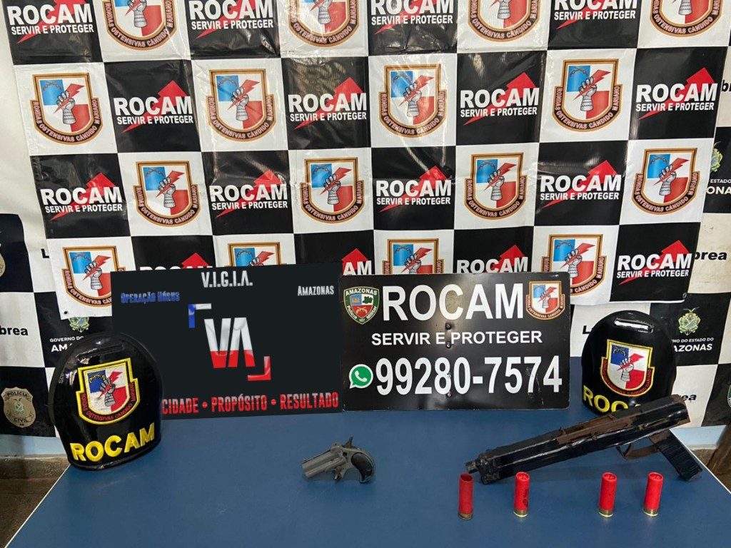 Policiais militares das Rondas Ostensivas Cândido Mariano (Rocam) e da Força Tática, na tarde desta quarta-feira (15/07), detiveram dois homens de 19 e 21 anos, porte ilegal de arma de fogo de uso permitido e restrito. A ação ocorreu na rua Dr Jorderval, no bairro Pantal, município de Lábrea (distante 701 quilômetros de Manaus).