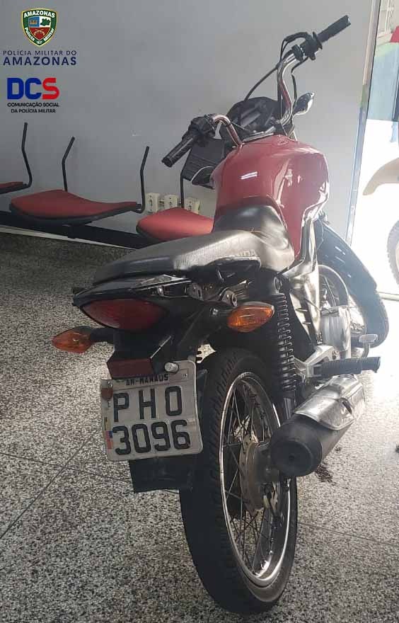 No Centro de Manaus, um homem de 32 anos que estava em posse da motocicleta Honda CG 125 Fan ES, preta, placa JXI-6171, com restrição de furto, foi preso na avenida Lourenço da Silva Braga. O infrator foi apresentado à Delegacia Especializada em Roubos e Furtos de Veículos (DERFV).