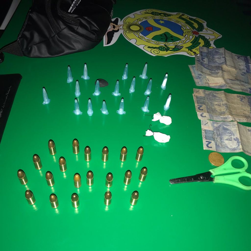 Policiais militares da 6ª Companhia Interativa Comunitária (Cicom) detiveram, na madrugada desta sexta-feira (21/08), um homem de 19 anos por tráfico de drogas no bairro Cidade Nova, zona norte da capital. Com ele, os policiais apreenderam duas trouxinhas de supostamente cocaína, dois pinos de supostamente cocaína, 20 munições calibre 9mm e a quantia de R$ 14,00 em espécie.