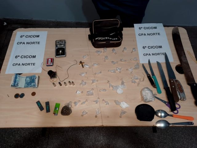 Na revista pessoal, foram encontrados 34 unidades de oxi, duas porções de cocaína, uma porção de skank, cinco munições calibre 38, R$ 14,55 em espécie, terçado, quatro facas, tesoura, balança, câmera, canivete, bolsa média e material para embalo da droga.