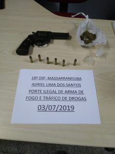 A Polícia Civil do Amazonas, por meio da equipe de investigação do 18° Distrito Integrado de Polícia (DIP), sob o comando do delegado Ivo Martins, titular da unidade policial, prendeu, em flagrante, na manhã de quarta-feira (03/07), por volta das 8h, Adriel Lima dos Santos, 28. Ele estava em posse de uma arma de fogo calibre 38, seis munições intactas, uma porção média e uma trouxinha de maconha, além de outra trouxinha de cocaína.