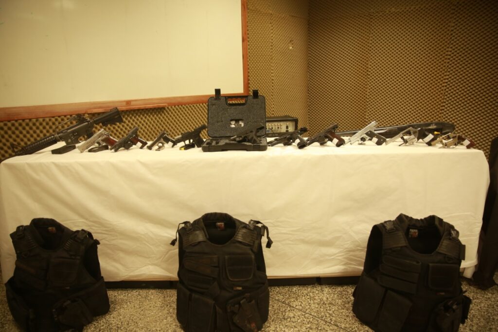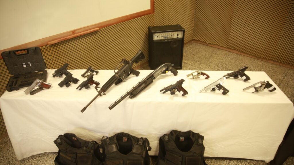 Ao ser abordado pelos policiais, ele revelou onde o restante do armamento estava escondido. Elas foram encontradas em um terreno baldio na avenida Arquiteto José Henriques, no bairro Monte das Oliveiras, na zona norte, dentro de uma mala preta. Ao todo, as equipes policiais tiraram das mãos dos criminosos 12 armas de fogo, sendo um fuzil AR 15, uma espingarda calibre 12, oito pistolas (9mm e calibres 765 e 45), dois revólveres (calibres 38 e 32), além de coletes balísticas e 38 munições.