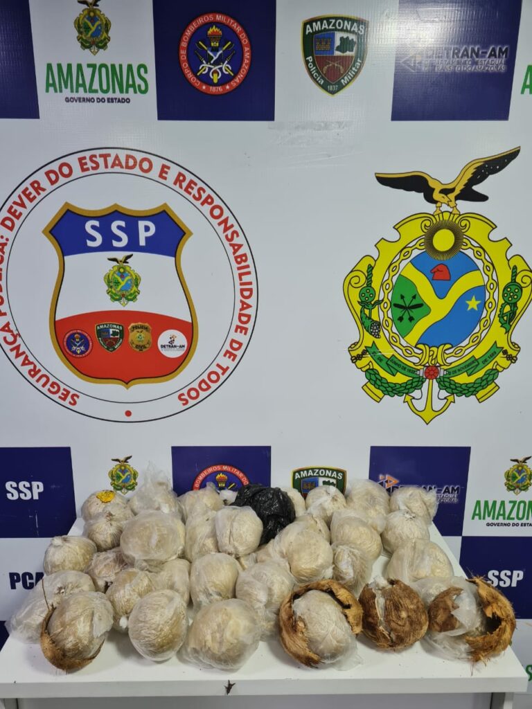 Por volta das 21h30, durante abordagem feita pelos policiais na embarcação “Itaberaba”, oriunda do município de Tabatinga com destino a Manaus, foram encontrados 19 quilos de pasta base de cocaína escondidos dentro de cocos.