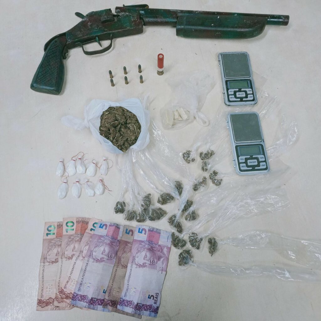 A ação policial resultou na apreensão de uma espingarda calibre 36, uma munição deflagrada do mesmo calibre, seis munições não deflagradas calibre 22, além 19 trouxinhas e uma porção de maconha, nove trouxinhas de cocaína, uma porção de oxi, duas balanças de precisão e R$ 40 em espécie. O material apreendido foi encaminhado para o 14º Distrito Integrado de Polícia (DIP).