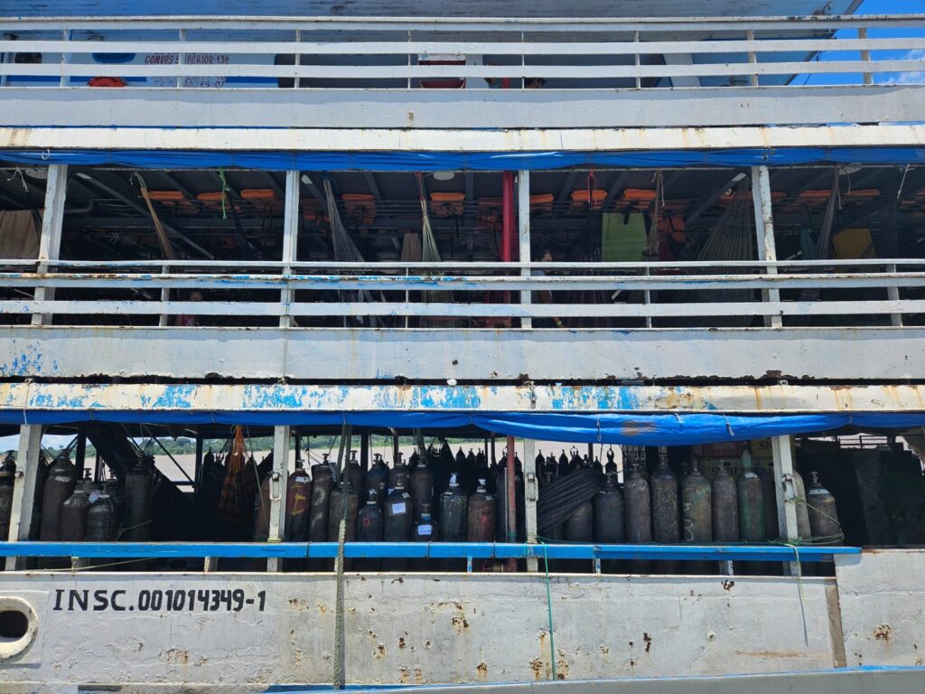 Durante uma vistoria de rotina, as equipes da Polícia Militar do Amazonas (PMAM), encontraram a embarcação com 94 passageiros, sete tripulantes, e ainda 127 cilindros que estavam sem a documentação e autorização para o transporte.
