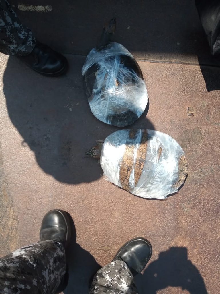 A primeira apreensão ocorreu por volta das 10h, durante abordagem à embarcação F/B Jesus Te Ama II, que vinha do município de Carauari. Foram encontradas duas malas com dois quelônios e aproximadamente 15 quilos de pirarucu. Não foi localizado o dono do material.