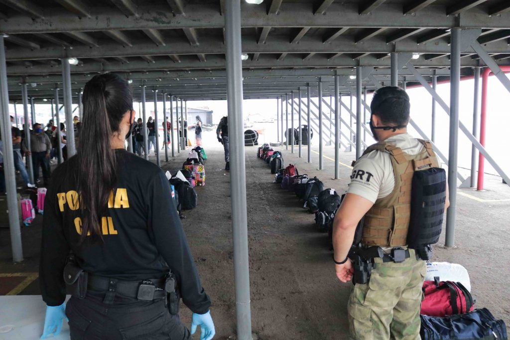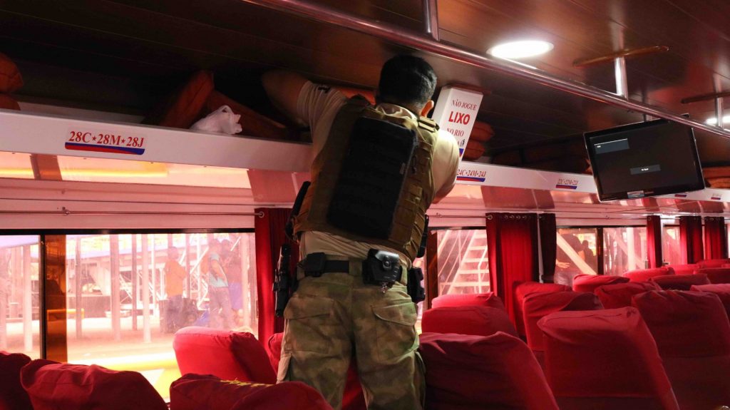 “Nós fazemos a revista em toda a embarcação, incluindo porões e todos os passageiros. A gente verifica as cargas, enquanto o cão passa nas bagagens. Temos os mergulhadores que vão por baixo da embarcação verificar se tem alguma coisa ilícita, se foi colocado algo ali”, informou.