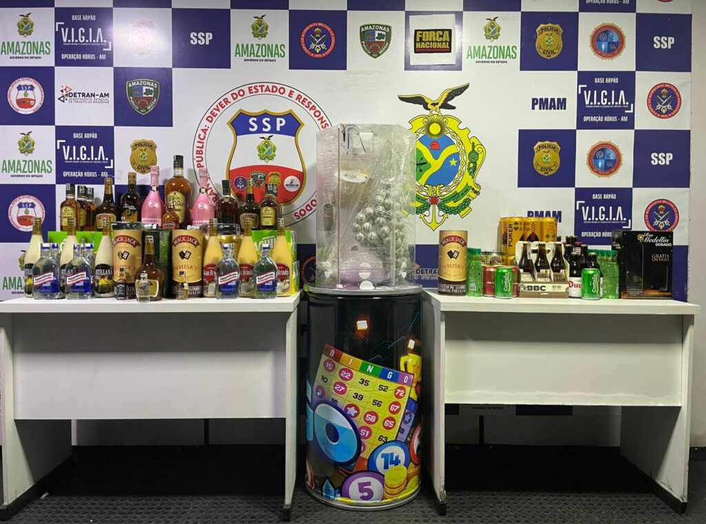 Segundo o relatório de ocorrência, durante as fiscalizações, os agentes localizaram uma grande quantidade de bebida alcoólica, sendo réplica de várias marcas de fabricação colombiana, além de uma máquina de bingo.