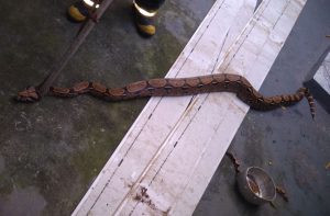 “Recebemos o chamado de que havia uma cobra no forro da cozinha de uma residência. A proprietária do imóvel percebeu que o forro havia cedido um pouco e tinha escutado uma movimentação no local e constatou que tratava-se de uma cobra. Nossa equipe precisou retirar o forro para resgatar o animal com a devida segurança. Ela [a cobra] estava se alimentando dos ratos que passavam pelo forro, seu peso é de mais ou menos 25 quilos”, relatou o militar.