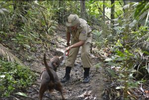 Treinamento – Existem dois tipos de treinamento feito com os cães. Um deles é o de busca por rastreio, onde o animal trabalha com o focinho no chão, seguindo o rastro da pessoa de um ponto A ao ponto B. Neste tipo de treinamento, o cão precisa de uma parte limpa da pessoa a ser procurada, além de ter de ter de cheirar um objeto com o cheiro da mesma, que no caso real dos cães do CBMAM, seria a vítima.