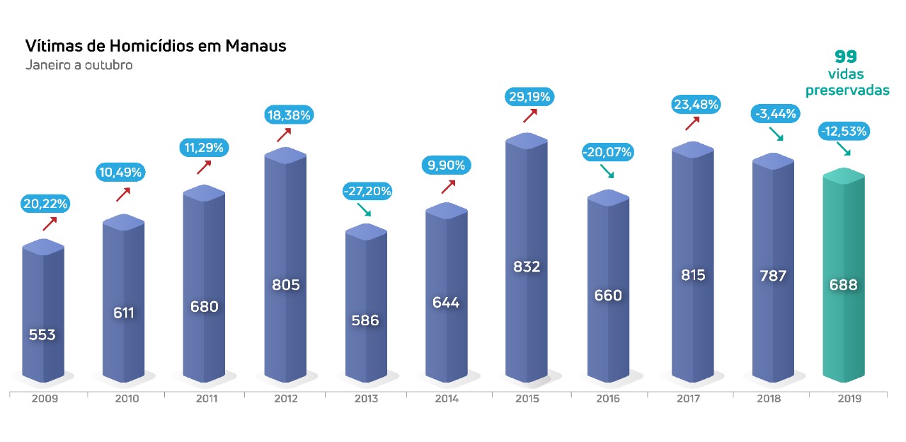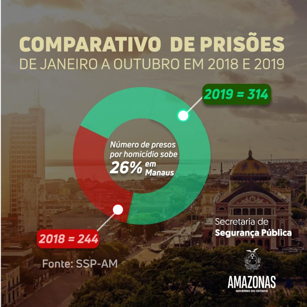 O número de prisões relacionadas aos crimes de homicídio, em Manaus, aumentou em 26,1% em 2019, de janeiro a setembro, conforme dados da Secretaria de Segurança Pública do Amazonas (SSP-AM). De janeiro até outubro, os homicídios acumulam redução de 12,6% na capital, isso significa 99 mortes a menos que o registrado em igual período de 2018.