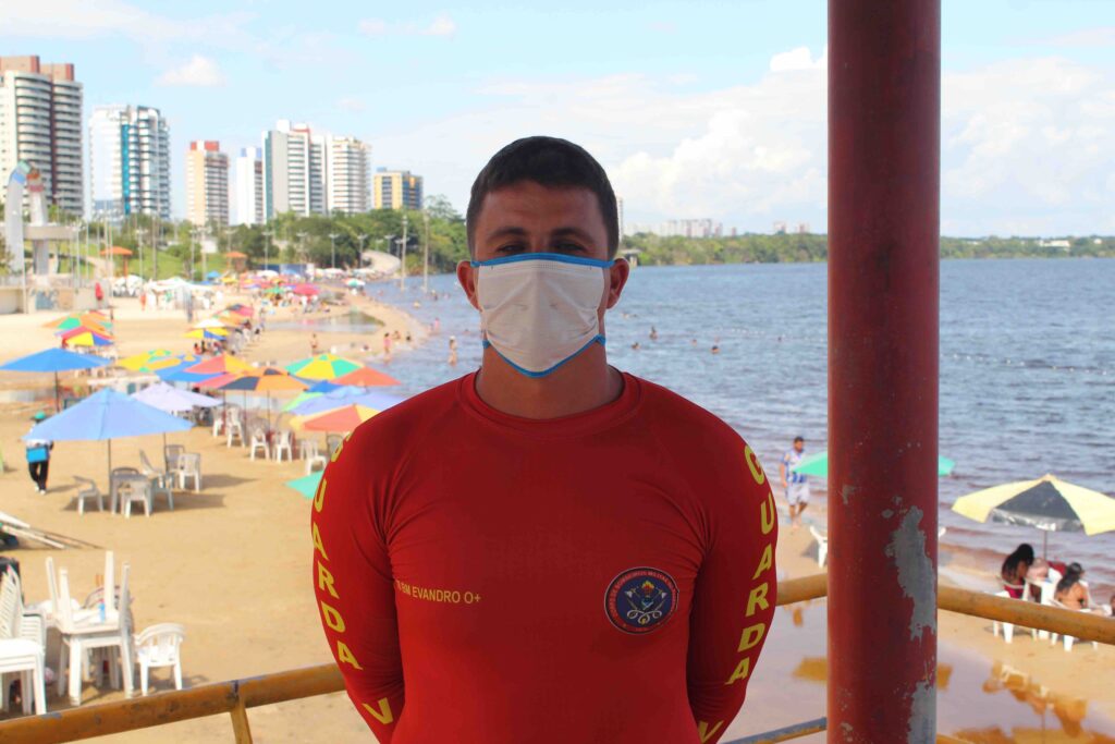 O cabo Pedro da Rocha Neto, do CBMAM, que atua como salva-vidas no bairro Ponta Negra, na zona oeste de Manaus, explica as medidas que devem ser tomadas nestes tipos de lugares ao lado das crianças.