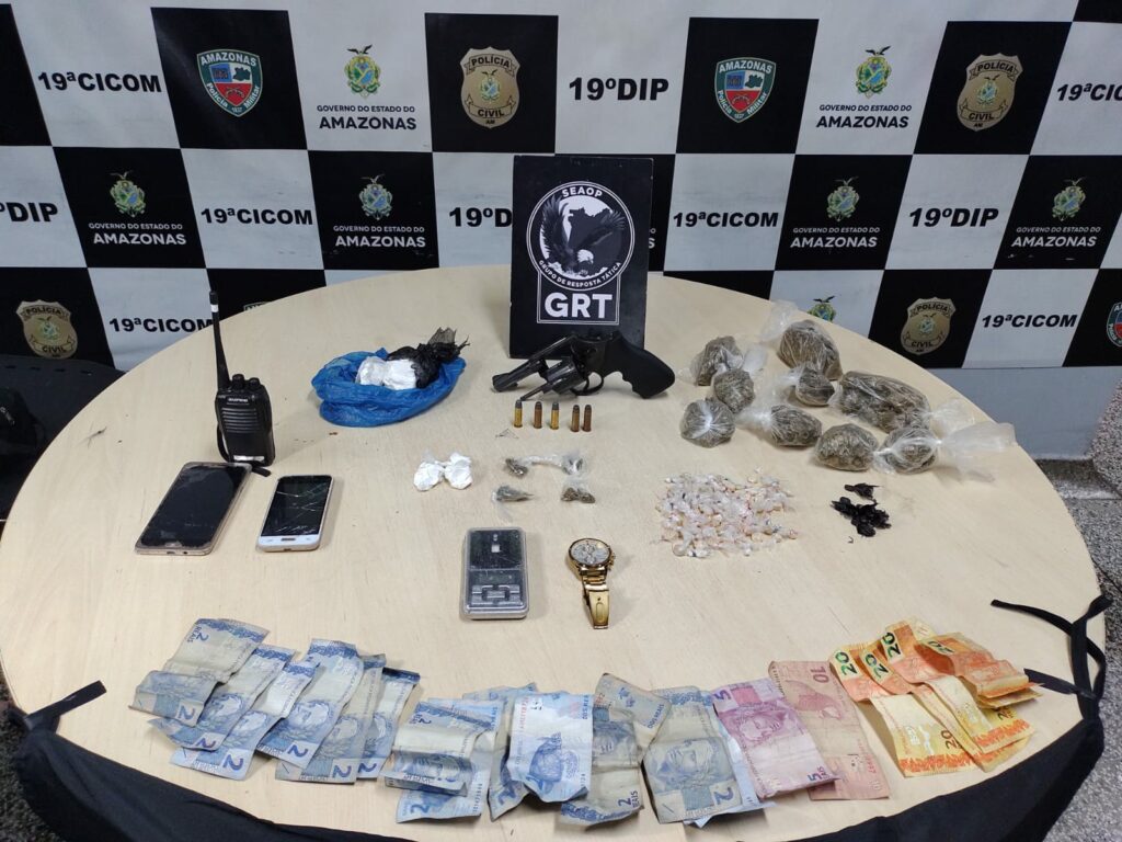 Durante revista pessoal, os agentes da Seaop encontraram com o suspeito um revólver calibre 38, cinco munições do mesmo calibre, quatro porções de maconha, nove de cocaína, 80 trouxinhas de oxi e um radiocomunicador.
