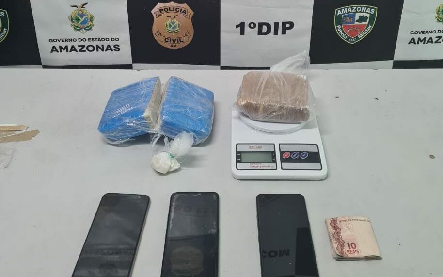Com o infrator, os agentes da SSP-AM apreenderam um tablete de oxi, pesando um quilo, um tablete e uma pequena porção de cocaína e duas porções de oxi. Também foi apreendida uma balança de precisão, além de três celulares e uma quantia de R$ 28 em espécie.