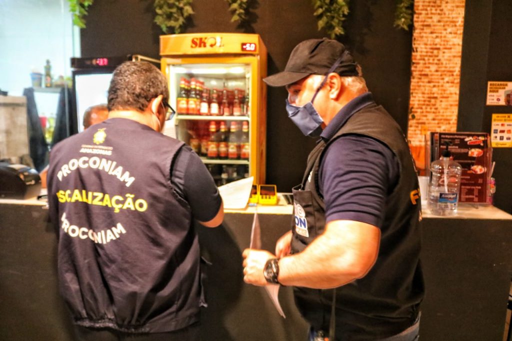 No bairro Parque Dez, o estabelecimento Espetos Eldorado foi notificado pelos agentes da vigilância sanitária por permitir o acesso de pessoas no local. Conforme o decreto, restaurantes só podem funcionar por meio de delivery.