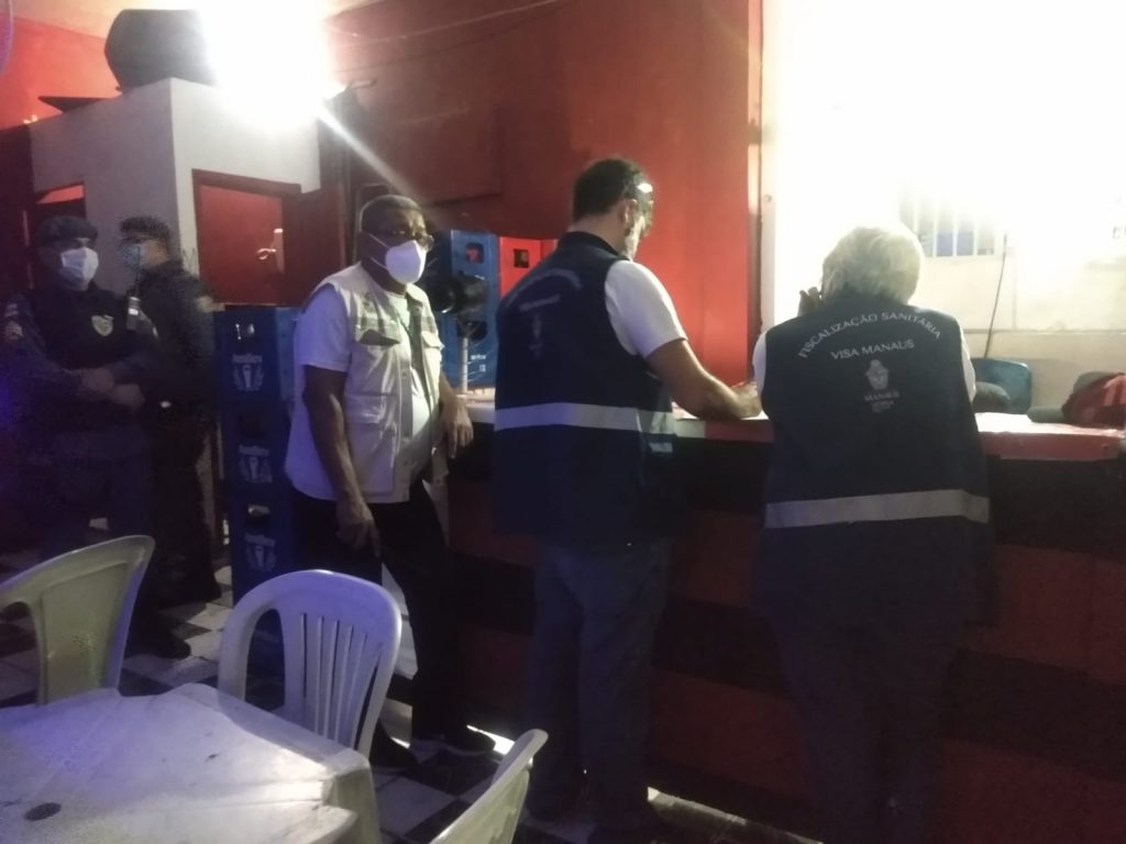 Na sexta-feira (18/12), foram fechados três bares. Um deles fica na rua Tirza Carvalho, no bairro Aleixo, zona centro-sul da capital, por aglomeração. O local também foi autuado pela Secretaria Municipal de Meio Ambiente, em 100 UFMs, por poluição sonora, e notificado por não possuir Auto de Vistoria do Corpo de Bombeiros.