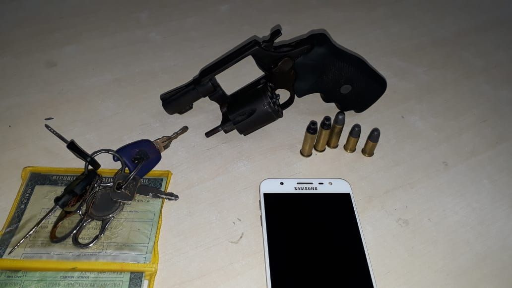 Os policiais faziam patrulhamento pela zona leste quando, por volta de 0h30, avistaram um veículo Fiat Palio com cinco indivíduos em atitude suspeita, na rua Graciliano Ramos. Foram feitos acompanhamento e abordagem e, durante revista pessoal e no interior do veículo, os policiais encontraram um revólver calibre 38, com cinco munições.