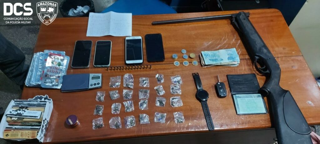 Em continuidade às diligências, os militares deslocaram ao endereço informado e, após as buscas no interior da residência, encontraram arma de fogo, tipo carabina de pressão adaptada para calibre 22, com 16 munições, uma balança de precisão, além de uma outra quantia em dinheiro de R$ 146, totalizando R$ 446 em espécie, quatro aparelhos celulares, um relógio de pulso, materiais para embalo de drogas e um dichavador (espécie de triturador portátil), contendo substância com aspecto de maconha.