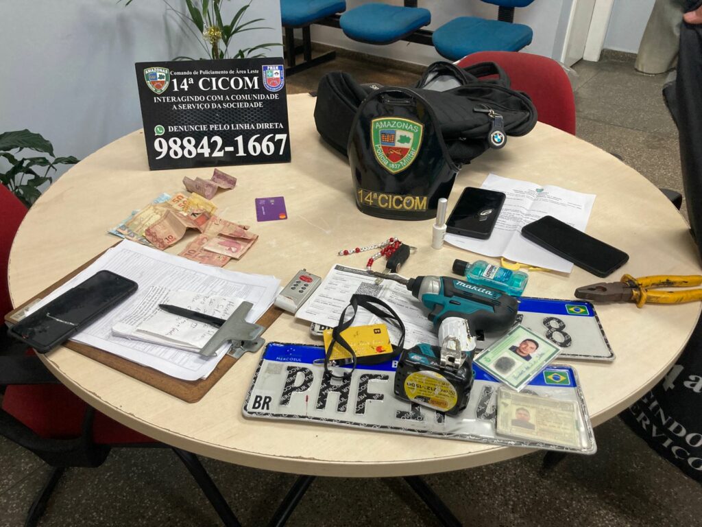 De acordo com informações policiais, os três infratores furtaram objetos de um veículo que estava no estacionamento em uma drogaria, localizada na avenida Efigênio Salles, bairro Adrianópolis, zona centro-sul da capital, usando o dispositivo “chapolin”, que impede o travamento das portas do veículo possibilitando a ação criminosa.