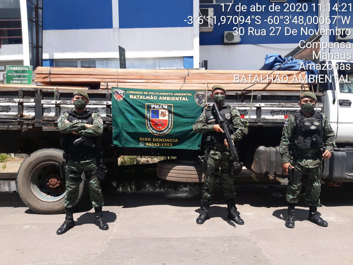 Policiais militares do Comando de Policiamento Ambiental (CPAmb), por meio do Batalhão de Policiamento Ambiental (BPAmb), apreenderam, na manhã desta sexta-feira (17/04), um caminhão contendo aproximadamente 20 metros cúbicos de madeira irregular no bairro Jorge Teixeira, zona leste da capital.