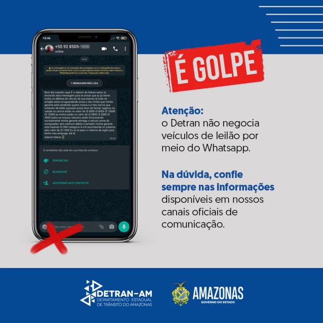 O Departamento Estadual de Trânsito do Amazonas (Detran-AM) volta a alertar a população sobre os golpes envolvendo o leilão do órgão, que vai ocorrer no período de quarta-feira (28/10) até sábado (31/10). Criminosos estão criando sites falsos com layout parecido com o dos leiloeiros oficiais e, ainda, negociando lances por meio do WhatsApp.