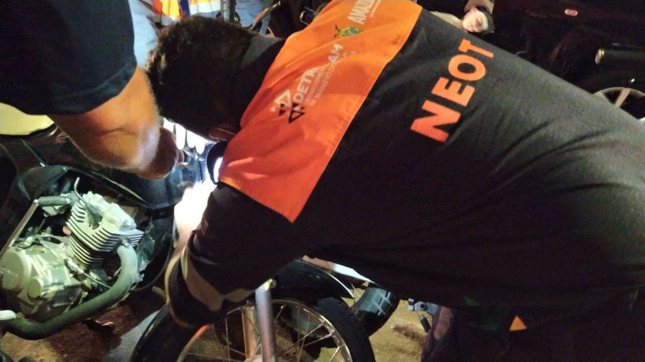Números – As ações do Neot, da noite de sexta até este sábado, resultaram na emissão de 32 autos de infração e no recolhimento de nove veículos. Um deles foi uma motocicleta Yamaha Fazer, cujo condutor tentou fugir, mas sem êxito, após a ordem de parada feita pelos policiais do BPTran na avenida Beira Rio, no bairro do Coroado, na zona leste da cidade.