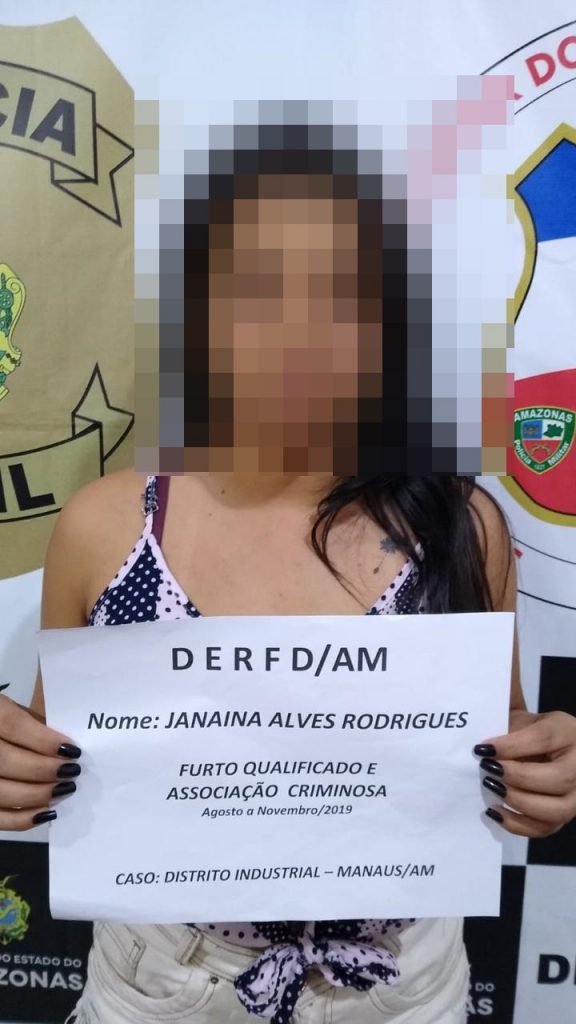 “Identificamos, até o momento, que quatro empresas receberam a matéria-prima furtada pelos infratores presos. Durante as diligências, foi efetuada a prisão de Fabiano no conjunto Boas Novas, bairro Cidade Nova, zona norte da capital. Em continuidade aos trabalhos, logramos êxito na prisão de Janaína na avenida Buriti, bairro Distrito Industrial, zona sul da capital”, relatou o titular da DERFD.