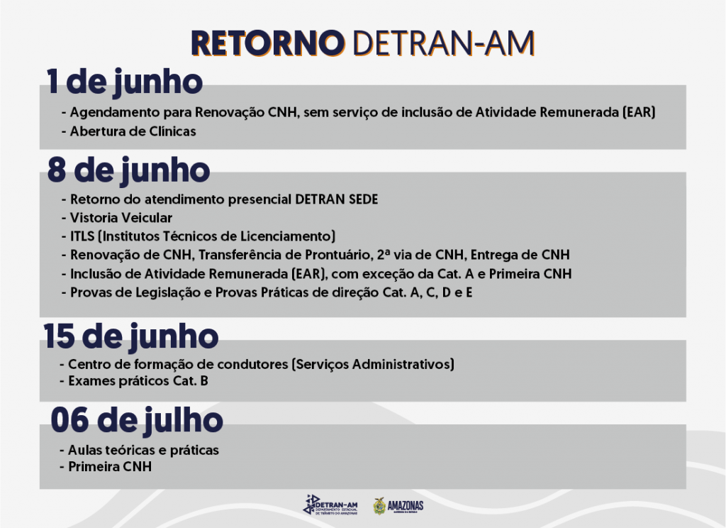No dia 1º, o Detran-AM liberará o agendamento para a renovação de CNH (Carteira Nacional de Habilitação), porém sem o serviço de inclusão de Atividade Remunerada (EAR). O processo será 100% on-line pelo Portal de Serviços de Pessoa Física (digital.detran.am.gov.br) e de maneira simplificada, sendo feito o aproveitamento da biometria e da fotografia daqueles usuários que renovaram a CNH nos últimos seis anos, cujos dados já estão nos arquivos do órgão. Esse aproveitamento dos dados já cadastrados para a renovação será mantido enquanto durarem as medidas de distanciamento social.