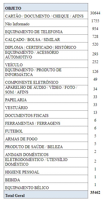 Do total de perdas e extravios, 30.644 foram de objetos no segmento de cartões, documentos pessoais e cheques. O segundo no ranking são os equipamentos de telefonia, com 954 registros. Na sequência aparecem acessórios, como bolsas e calçados, com 728 casos, e os diplomas e certificados, com 520 notificações.