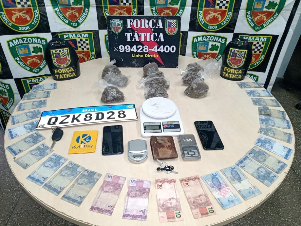 Na madrugada deste domingo (04/07), policiais militares da Força Tática detiveram, por volta dos primeiros 30 minutos do dia, um jovem de 18 anos e um homem de 43 encontrados com material entorpecente dentro do carro que ocupavam, um Fiat/Uno de cor preta, placa QZK 8D28, transitando na avenida Mirra, bairro Jorge Teixeira, zona leste.