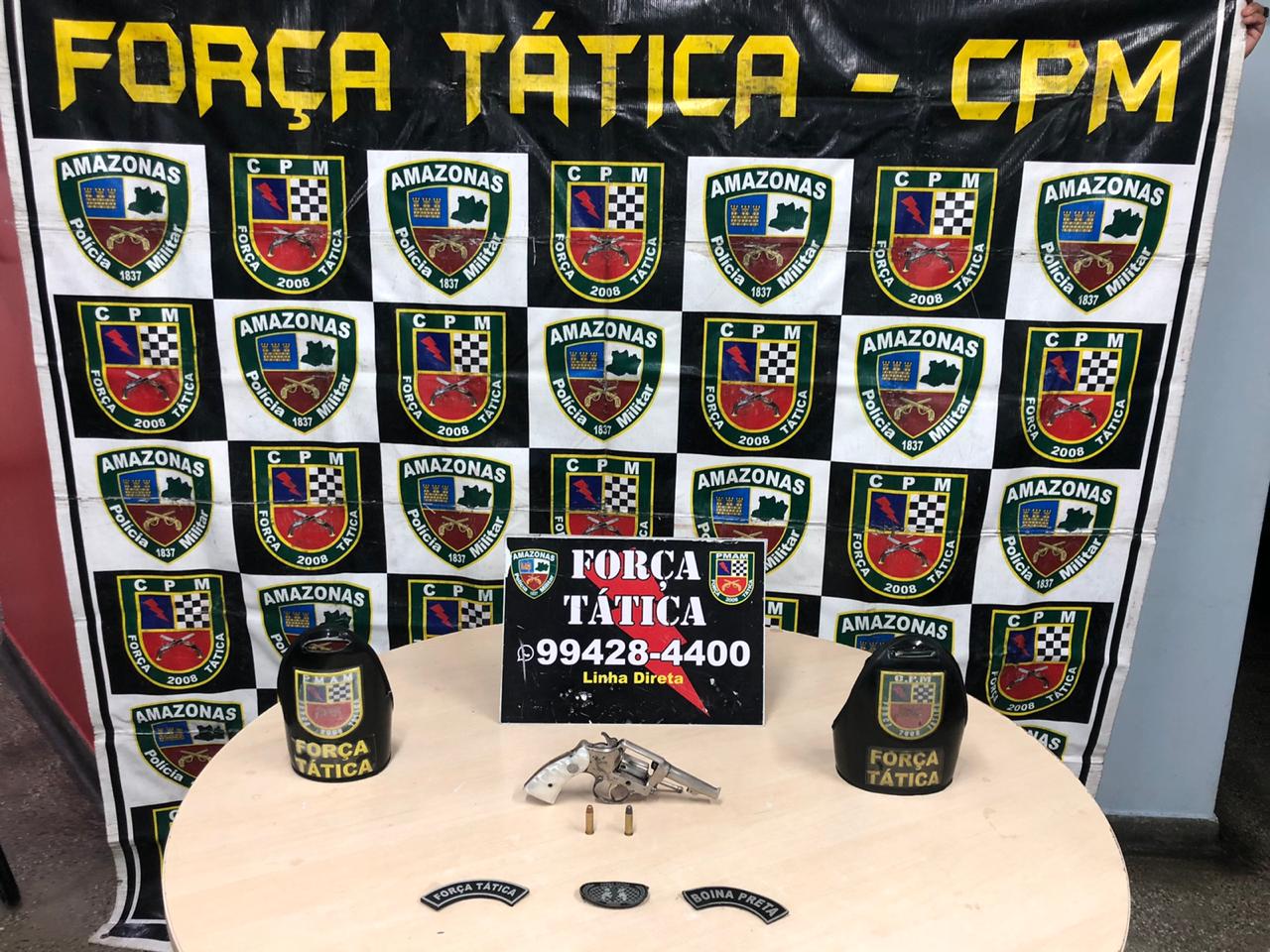Policiais militares da Força Tática, na noite desta sexta-feira (17/04), detiveram dois jovens de 18 e 21 anos e apreenderam um adolescente de 17 anos, por direção perigosa e porte iegal de arma de fogo. Com eles foram apreendidos um revólver Taurus de calibre 38 e numeração suprimida; e duas munições de calibre 38, sendo uma intacta e outra percutida e não deflagrada.