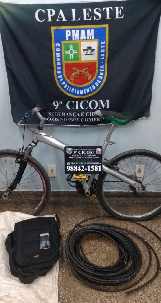 Durante o patrulhamento na avenida Cosme Ferreira, uma equipe policial da 9ª Cicom foi acionada pela supervisão de área da unidade, informando que nas proximidades de um shopping dois indivíduos haviam sido detidos por funcionários de uma empresa de telefonia, que flagraram a dupla cometendo furto dos materiais. Os homens foram pegos após o acionamento do alarme da empresa.