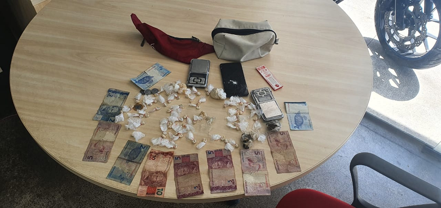 Diversos papelotes de drogas, duas balanças de precisão, um aparelho celular e R$ 40 em espécie foram apreendidos.