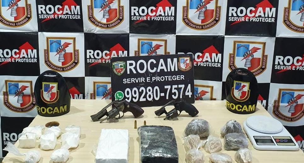 Policiais militares da Ronda Ostensiva Cândido Mariano (Rocam) detiveram, nesse sábado (06/3), dois homens por tráfico de drogas e porte ilegal de arma de fogo, no bairro Riacho Doce, zona norte de Manaus. Durante patrulhamento pela zona norte, a equipe policial recebeu uma denúncia, via WhatsApp da Rocam, de que na rua Santos Dias, no mesmo bairro, um indivíduo em posse de uma mochila, possivelmente com entorpecentes, teria entrado em uma kitnet.