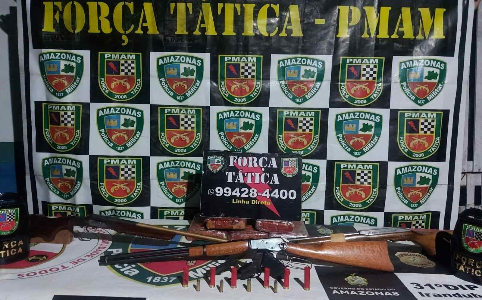 Policiais militares da Força Tática, em diferentes ações na capital e em Iranduba (a 27 quilômetros de Manaus), apreenderam seis armas de fogo de variados calibres, munições e mais de 6 quilos de entorpecentes, além de prenderem um homem de 22 anos.