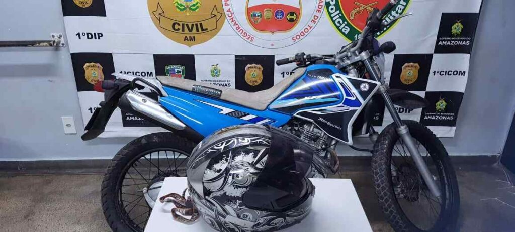 Uma equipe da Força Tática apreendeu uma motocicleta modelo Honda/CG 150 Fan ESI, de, cor amarela e placa OAO-9007, e deteve um homem, de idade não informada, na rua Abel, bairro Novo Aleixo, zona norte, onde ele circulava em atitude suspeita. Na abordagem, foi constatado que o veículo possuía restrição de roubo, e o suspeito confessou aos policiais que havia cometido vários roubos usando a moto, e que teria guardado os objetos subtraídos em sua residência.