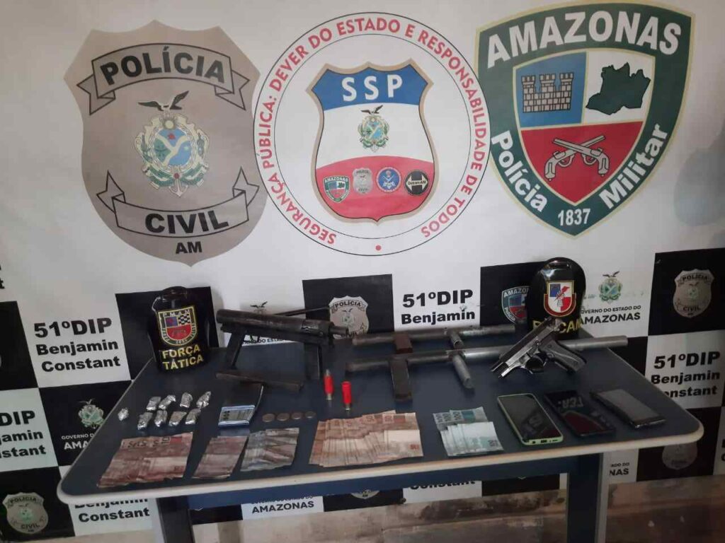 Policiais militares da 2ª Companhia de Polícia Militar (CPM), Batalhão de Força Tática e Rondas Ostensivas Cândido Mariano (Rocam), em desdobramento da operação “Hórus”, na tarde desta quinta-feira (17/06), apreenderam dois adolescentes de 15 e 17 anos, e detiveram dois homens, de 25 e 28 anos, em posse ilegal de armas de fogo e entorpecentes, no município de Benjamin Constant (distante 1.121 quilômetros da capital).