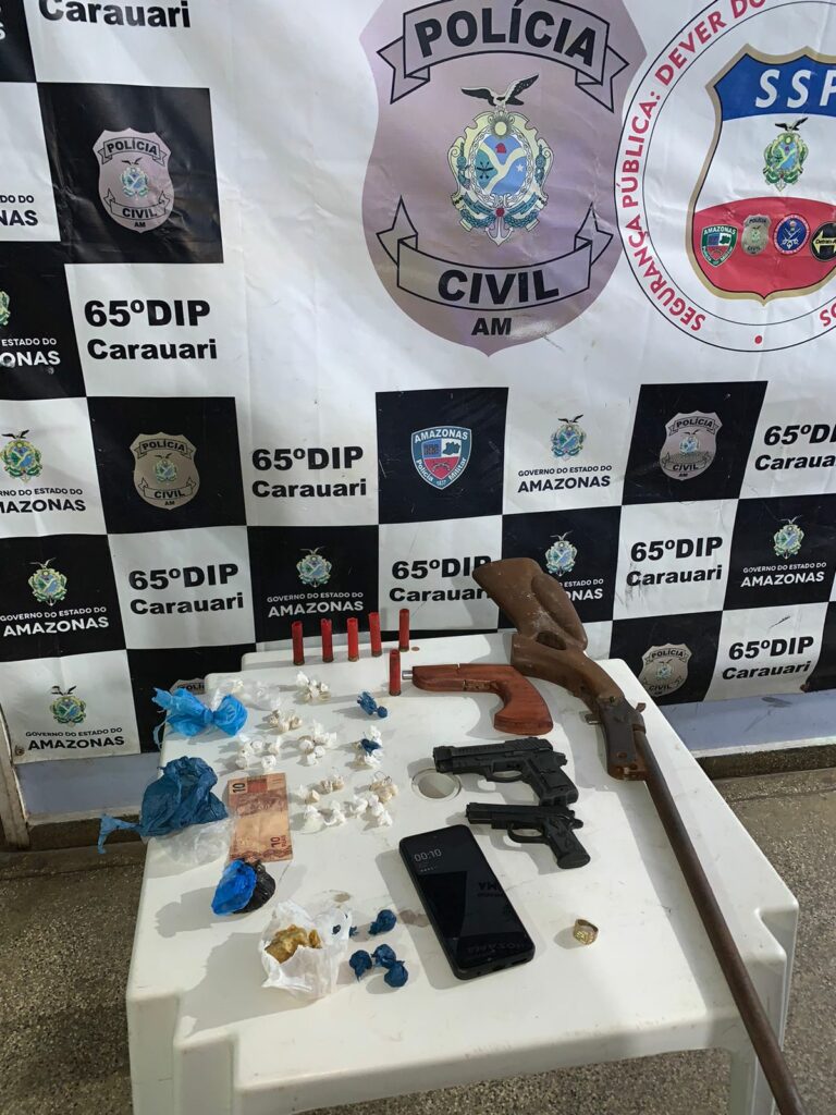 A Polícia Civil do Amazonas (PC-AM), por meio da 65ª Delegacia Interativa de Polícia (DIP) de Carauari, em conjunto com a Polícia Militar do Amazonas (PMAM), prendeu em flagrante, na quinta-feira (18/01), Fernando Costa da Silva, 18, em posse de simulacros de espingarda e drogas do tipo crack e maconha. Um adolescente também foi apreendido no momento da ação policial, ocorrida no bairro 55 daquele município (a 788 quilômetros de Manaus).