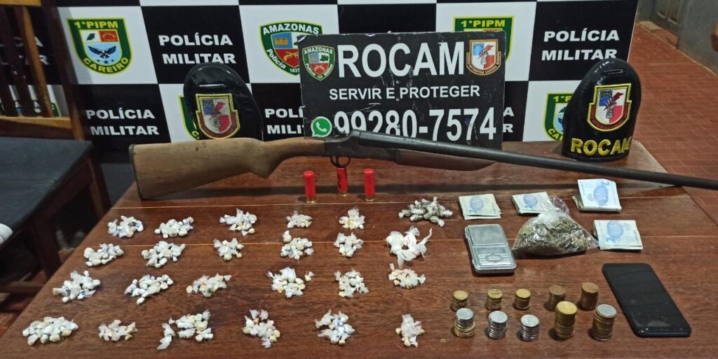 Na ação, a Rocam apreendeu uma espingarda calibre 16 com numeração, três munições de calibre 16 intactas; 220 trouxinhas de substância com aspecto de oxi; 15 Trouxinhas de substância com característica de skunk; quatro trouxinhas de substância com aspecto de cocaína; uma porção pequena de substância com característica de cocaína (5 gramas); uma porção média de substância com aspecto de maconha (40 gramas), uma balança de precisão, um aparelho celular; e R$ 71,00 em espécie.