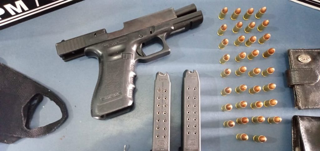 Após constatar a presença do suspeito na casa, os policiais militares fizeram buscas. No quarto da mãe do homem, foram encontrados uma arma de fogo tipo pistola (calibre 9MM) com numeração suprimida e dois carregadores, contendo 17 munições (cada um) do mesmo calibre. Também houve a apreensão de determinada quantia em dinheiro.