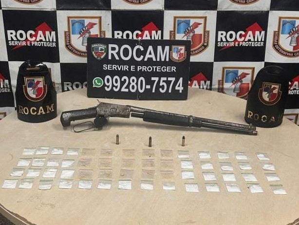 Em ações nas zonas leste e oeste, policiais militares da Rocam apreenderam três armas de fogo, sendo dois revólveres, um de calibre 22 e outro 38, e um rifle calibre 38. Além das armas, também foram apreendidas sete munições, 86 porções de drogas, entre cocaína, oxi e maconha, uma réplica de arma (simulacro) e uma balança de precisão.
