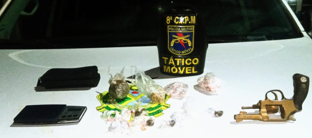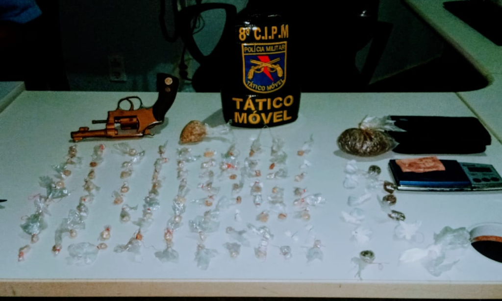 Na ocorrência foi apreendido um revólver calibre 32, sem munição, uma porção Média de substância com aspecto de oxi, uma balança de precisão, 80 trouxinhas de substância com característica de oxi, uma trouxinha com substância com característica de Cocaína em pó, uma porção grande de maconha, dinheiro no valor de R$ 10,00 e 11 trouxinhas de substância com aspecto de maconha.