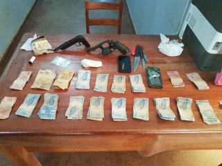 Durante a revista pessoal, foi encontrada uma arma de fogo calibre 38, com numeração raspada, contendo uma munição intacta. Com a devida autorização, os policiais efetuaram buscas na residência denunciada e encontraram uma arma caseira, com cartucho calibre 28; 107 gramas de substância com aspecto de oxi; um smartphone; R$ 375 em espécie, três facas e material para embalar entorpecentes.