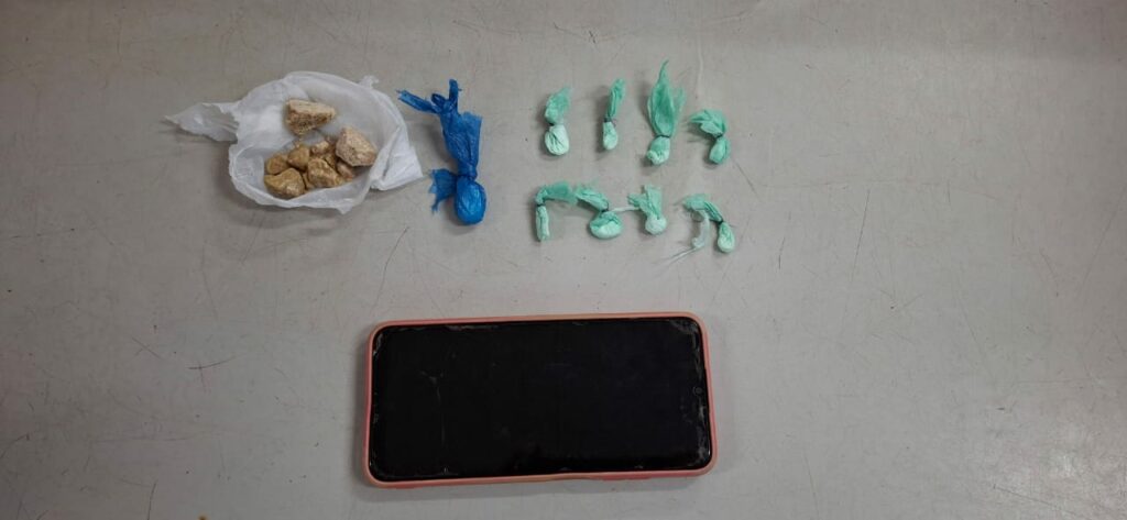 Durante os procedimentos de abordagem, foi constatado que dentro da sacola havia nove trouxinhas de cocaína, uma pedra de oxi, além de um aparelho celular.