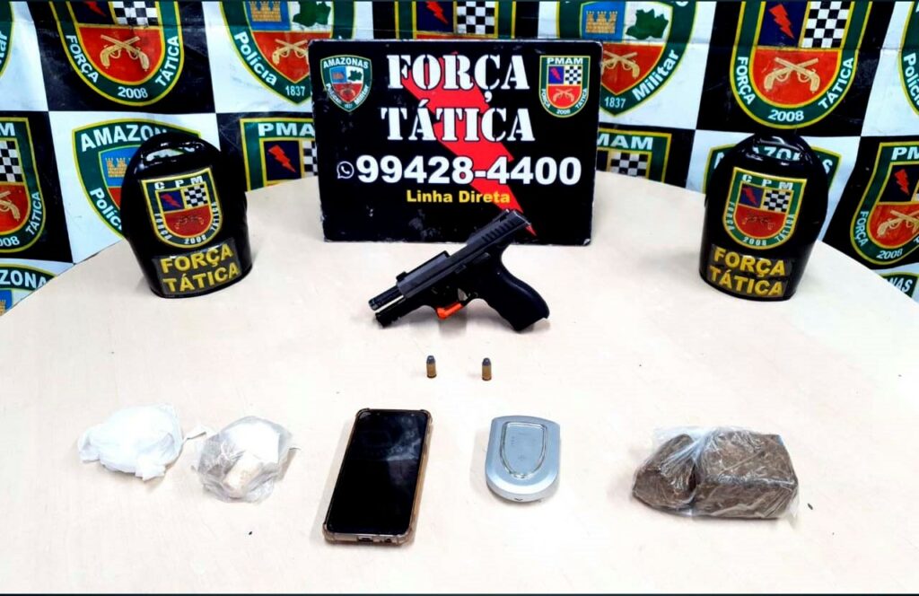 Ainda no Tancredo Neves, policiais militares da Força Tática prenderam um homem de 20 anos, em flagrante, por porte ilegal de arma de fogo e tráfico de drogas. Foram apreendidas uma arma de fogo, duas munições intactas, um carregador de pistola, uma balança de precisão, uma porção média de maconha e três porções médias de oxi. O suspeito foi encaminhado ao 14° DIP.