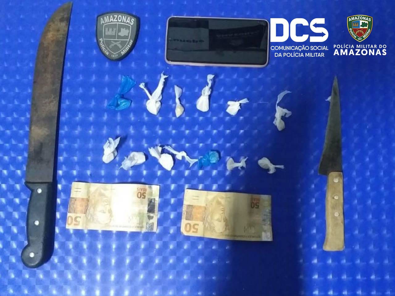 Um homem de 21 anos e uma mulher de 22 anos foram detidos por tráfico de drogas no bairro Santo Antônio, município de Eirunepé (a 1.160 quilômetros da capital). Com eles, os policiais apreenderam 13 porções de pasta base de cocaína, um aparelho celular Samsung, duas facas tipo peixeira e R$ 100,00 em espécie.