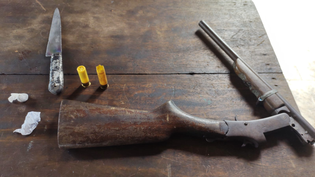 A guarnição ao chegar ao local, identificou dois suspeitos e fez a abordagem. Um deles, ao perceber a aproximação da viatura policial, conseguiu fugir; mas os policiais detiveram o outro indivíduo. Na revista pessoal foi encontrada uma espingarda de uso restrito, calibre 20, com a numeração suprimida, e com uma munição intacta e outra deflagrada.