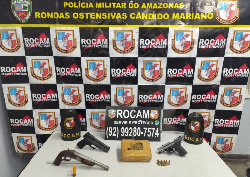A Polícia Militar do Amazonas (PMAM), por meio das Rondas Ostensivas Cândido Mariano (Rocam), apreendeu duas armas de fogo e aproximadamente 1 quilo de droga, na noite de quarta-feira (12/02), no bairro Novo Aleixo, zona norte de Manaus.